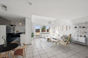 Die Wohnung verfügt über 2 geräumige Schlafzimmer und 1 Badezimmer, das mit hochwertigen Materialien und modernem Design ausgestattet ist. Der Bodenbelag wechselt harmonisch zwischen Fliesen und Laminatboden, um sowohl Komfort als auch Stil zu gewährleisten.
